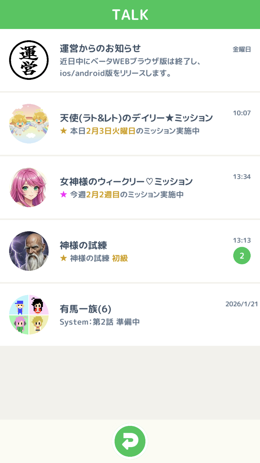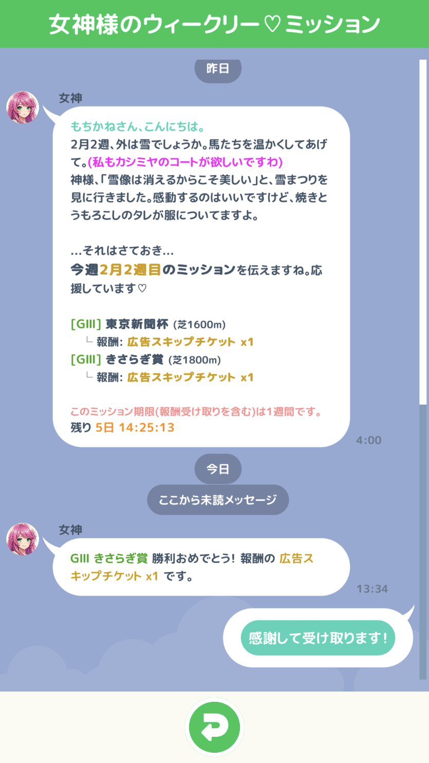 ミッション確認からストーリー進行まで、あらゆる情報をチャット形式のUIにまとめた。プレイヤーは届いたメッセージを開き、報酬を受け取り、時には選択肢で返答する。ゲーム的な「ミッション消化」を、オーナーとしての「連絡確認」に置き換えることで作業感をなくし、世界観に浸れるようにした。