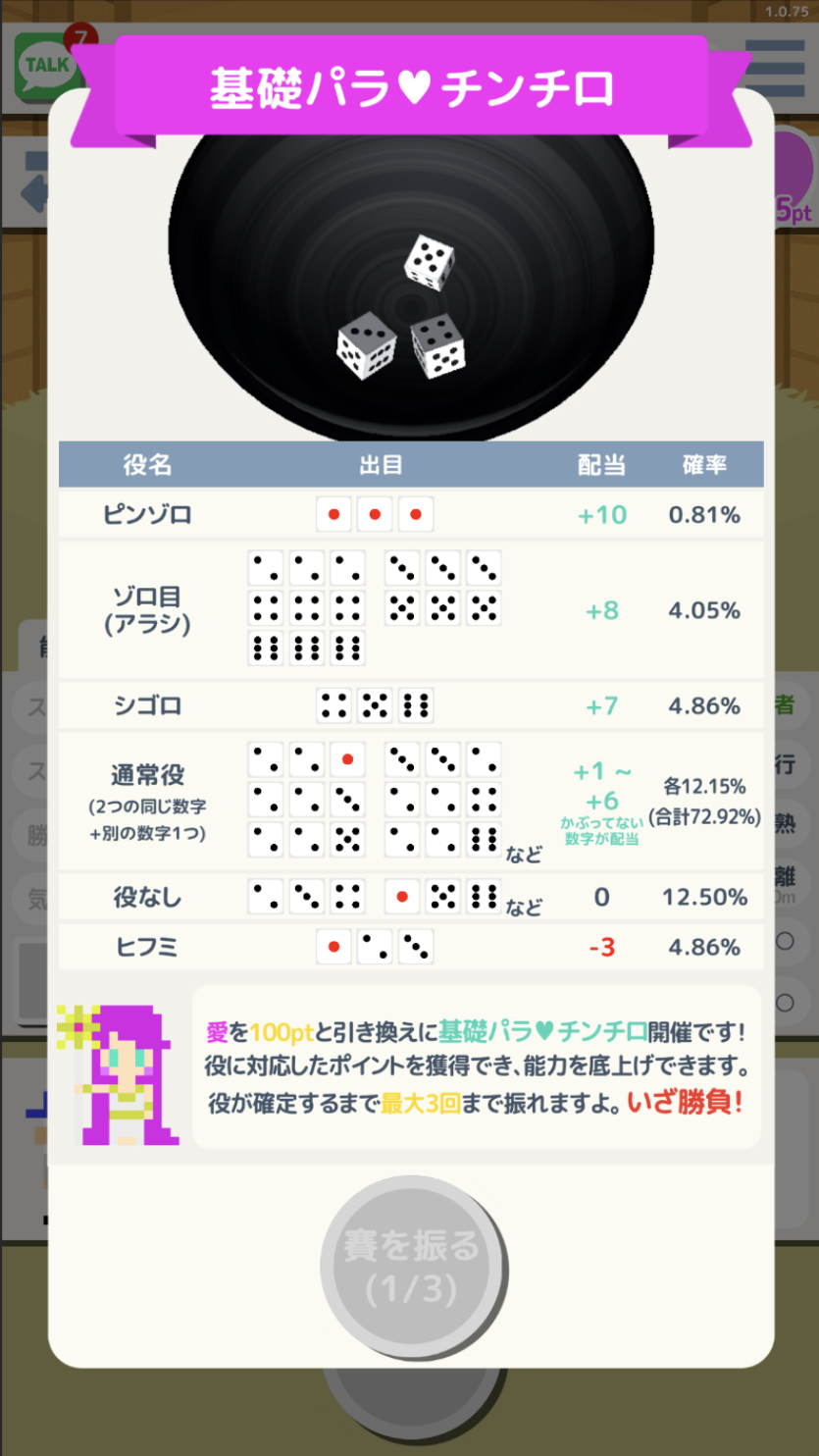 育成内容を評価する「愛」システムを搭載。無傷での完走やタイトルを獲得するほどポイントが貯まり、複数世代重ねることで最大になる。ポイントが貯まるとボーナスゲームの「基礎パラチンチロ」が発動。3つのサイコロを振り、出た「役」に応じて4大基礎パラメータ(スピード、スタミナ、勝負根性、気性)にポイントを振り分ける事ができる。運否天賦のサイコロ勝負で能力の底上げが可能だ。