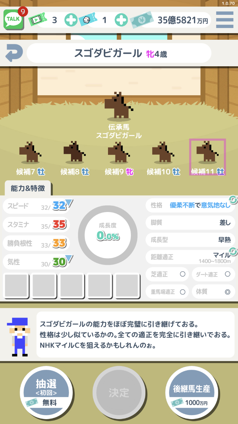 厳選し育成を終えた愛馬の基礎能力をベースに、後継生産で適性や性格をチューニング。世代を重ねるごとに弱点が消え、「完璧な馬」へと進化していく育成サイクルを楽しめる。