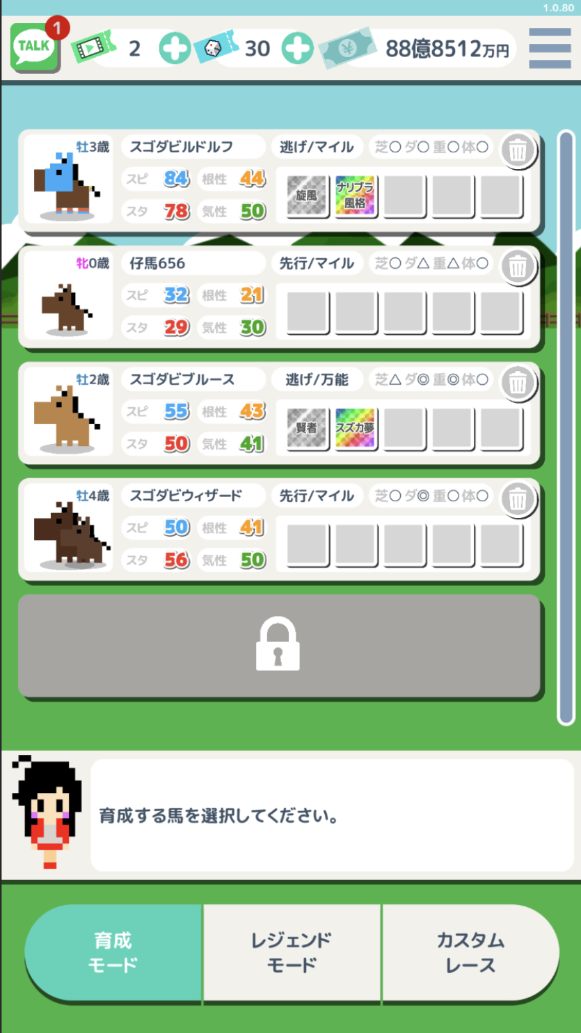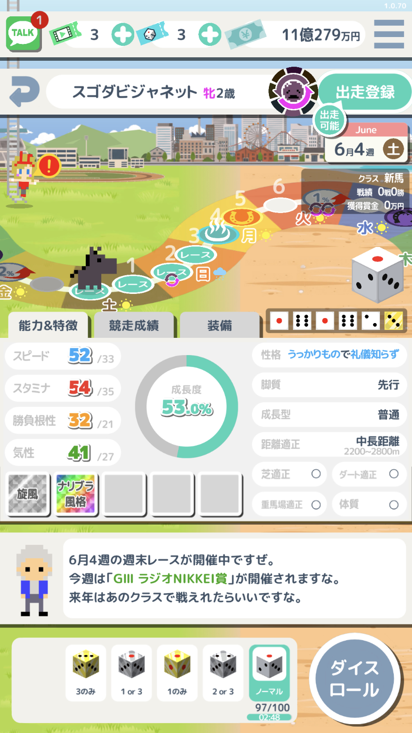 育成はスゴロク形式で進行する。「特殊ダイス」で出目を意図的に操作し、狙ったトレーニングやイベントマスへ確実に止まることが可能。調教マスではアビリティを閃くことがあり、特に激レアの「虹アビリティ」は極めて強力な効果を発揮する。