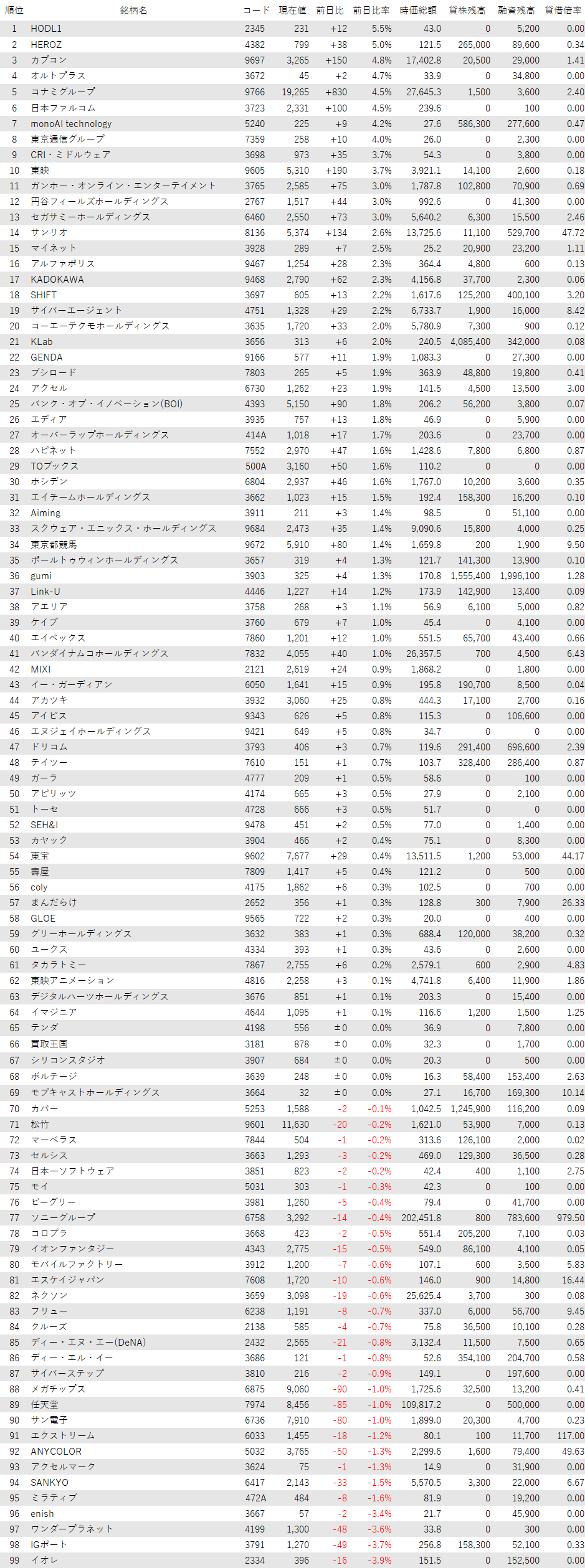 最後に騰落ランキングを見ると、HODL1<2345>やHEROZ<4382>、カプコン<9697>、オルトプラス<3672>、コナミG<9766>が値上がり率上位となり、IGポート<3791>、ワンダープラネット<4199>、enish<3667>、ミラティブ<472A>、SANKYO<6417>が値下がり率上位となった。