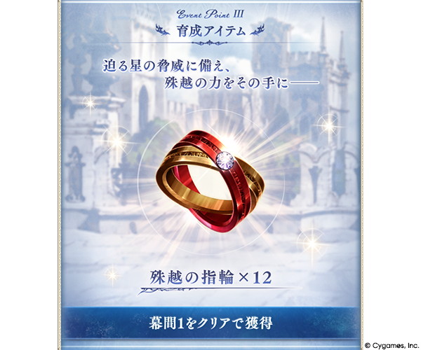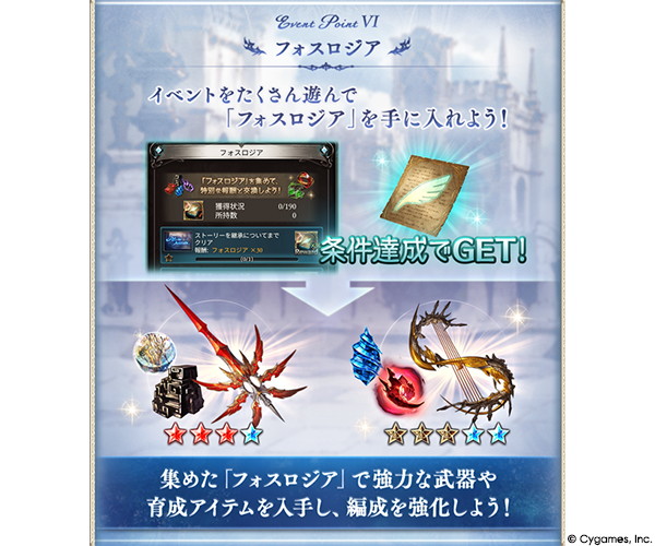 また、バトルで入手した戦貨を用いてイベント専用のBOXガチャを引ける。「金綬の贈り物」や「銀綬の贈り物」からは、希少なアイテムが手に入る場合がある。さらに、バトルで貢献度や討伐章を獲得すれば、豪華なトレジャーアイテムも入手できる。イベントストーリークリアや各種イベント報酬獲得で得られる特別なアイテム「フォスロジア」は、武器の強化に必要な素材セットや「殊越の指輪」などの育成アイテムと交換できる。