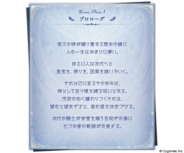 本イベントは、七曜の騎士と星の民の関係が覇空戦争以前まで遡るストーリーを展開する。イスタルシアから帰還した主人公たちは束の間の休息を楽しむ中、父のかつての仲間の娘であるリーシャの碧の騎士就任の報せと就任式の招待が届く。主人公たちは旅の中で何度も世話になったリーシャを祝うべく、秩序の騎空団の本拠地が置かれるカルエス・グランデ空域へと進路を取るが、そこには再会だけではなく、星との因縁が待ち受けている。