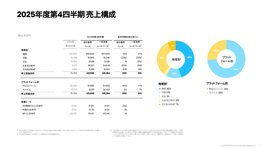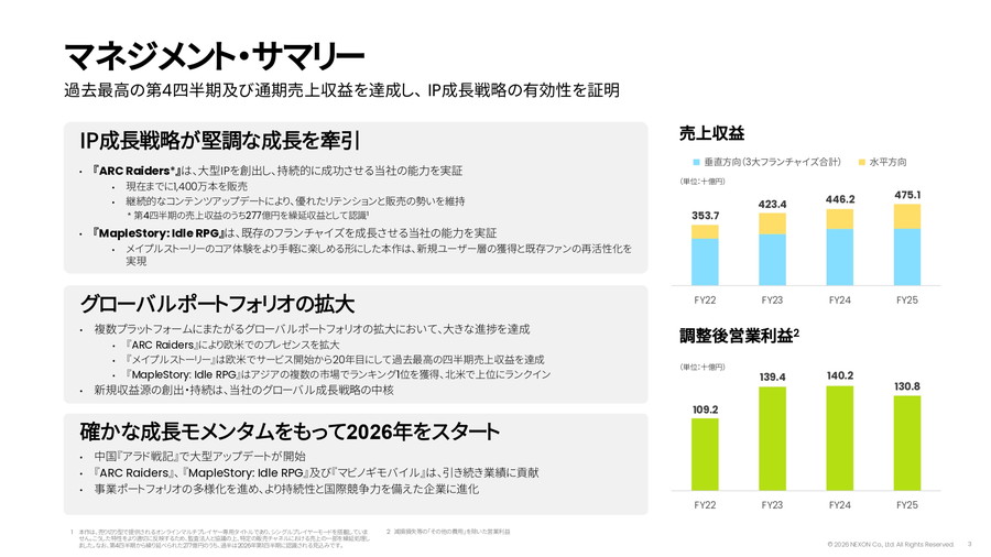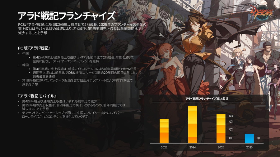 PC版『アラド戦記』は中国・韓国ともに2桁成長を達成。韓国では通期売上が前年比108%増と大きく伸び、20周年の節目を飾った。一方、『アラド戦記モバイル』は減収だった。フランチャイズ全体では通期で前の期比21%減となった。2026年はモバイル版の再成長が最優先課題となる。