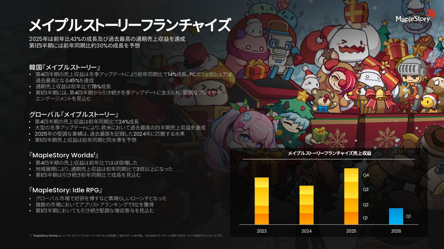 『メイプルストーリー』は韓国・グローバルともに好調で、フランチャイズ売上は通期で前年比43%増となり、サービス22年目で過去最高を更新した。韓国ではPCカフェシェア45%を記録している。『MapleStory Worlds』も前年比約3倍と拡大。『MapleStory: Idle RPG』を含め、IPの多面的展開が進んだ。