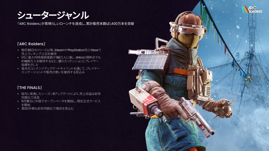 『ARC Raiders』に加え、『THE FINALS』も増収を確保した。中国展開も進んでおり、シューター領域は新たな柱へ成長しつつある。