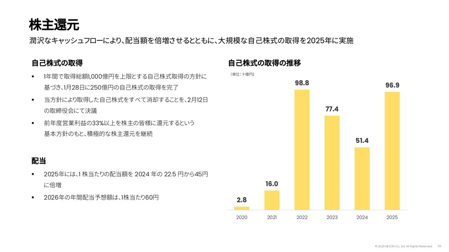 2025年は配当を1株45円へ倍増し、969億円の自己株式取得を実施した。さらに1000億円枠の自社株買いを完了し、取得株式の全消却も決議した。2026年は年間60円配当を予定する。