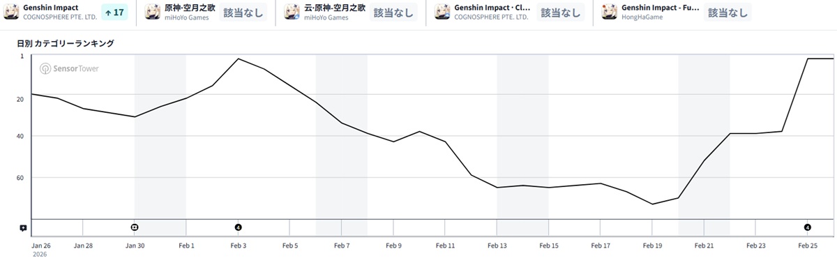 『原神』は2月25日にバージョンLuna Ⅴ「風を捕まえる帰郷者」をリリース。新★5キャラクター「ファルカ(風)」が登場するイベント祈願・キャラクター「北風の凱旋歌」をはじめ、各種イベント祈願を開催しており、売り上げを伸ばしたようだ。