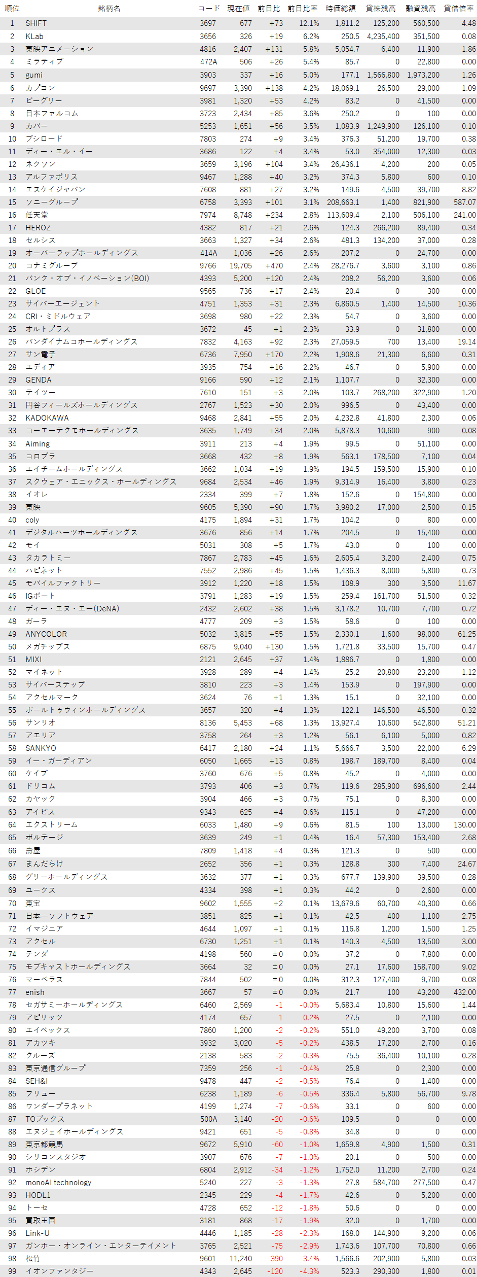 最後に騰落ランキングを見ると、SHIFT<3697>やKLab<3656>、東映アニメ<4816>、ミラティブ<472A>、gumi<3903>が値上がり率上位となり、松竹<9601>、ガンホー<3765>、Link-U<4446>、買取王国<3181>、トーセ<4728>が値下がり率上位となった。