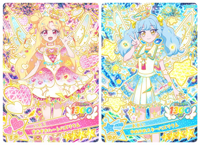 「1だん」の「バズリウムコーデ」のカードには主人公の「いのり」と「あおい」がラインアップされ、“つばさ”がキラキラと輝くホログラムと箔押しデザインになっている。配出されるアイプリカードは羽根をモチーフにしたフレームをベースにデザインフォーマットを一新し、★2から★4までのレアリティの新たなデザインカードで展開する。