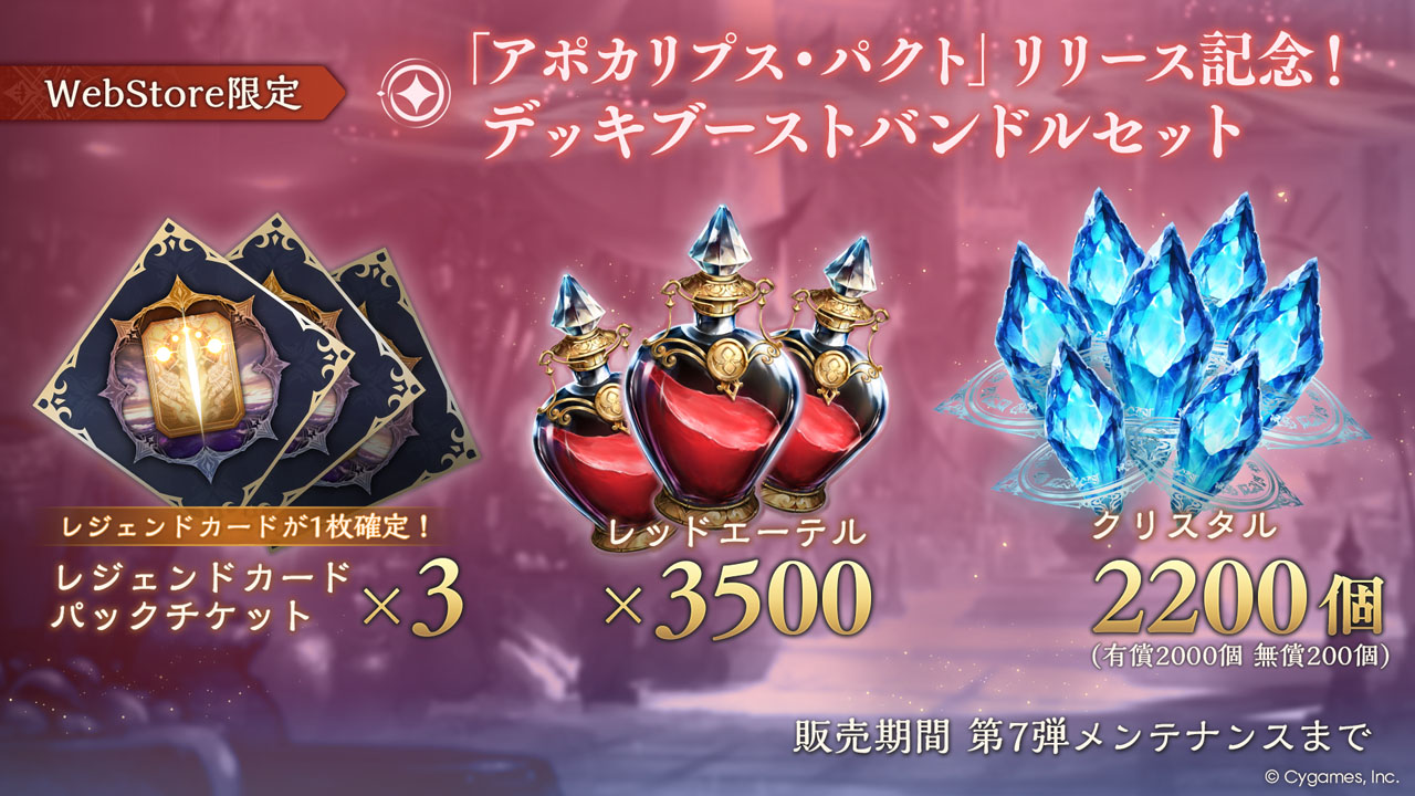 「Apocalypse Pact / アポカリプス・パクト」のリリースを記念して、Cygames WebStore 限定でお得にクリスタルを購入できる「『アポカリプス・パクト』リリース記念!デッキブーストバンドルセット」を販売する。