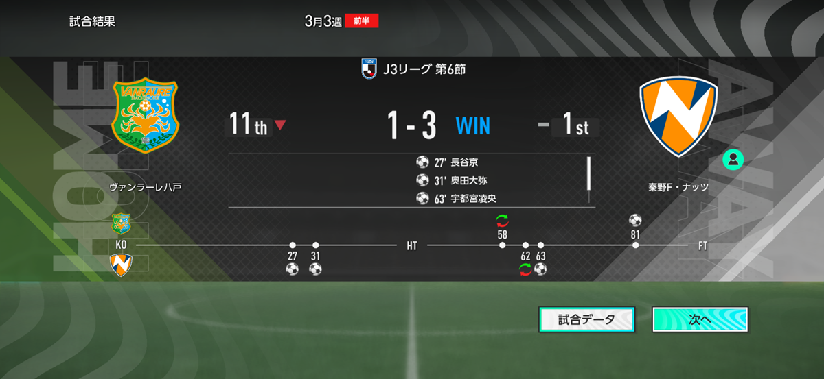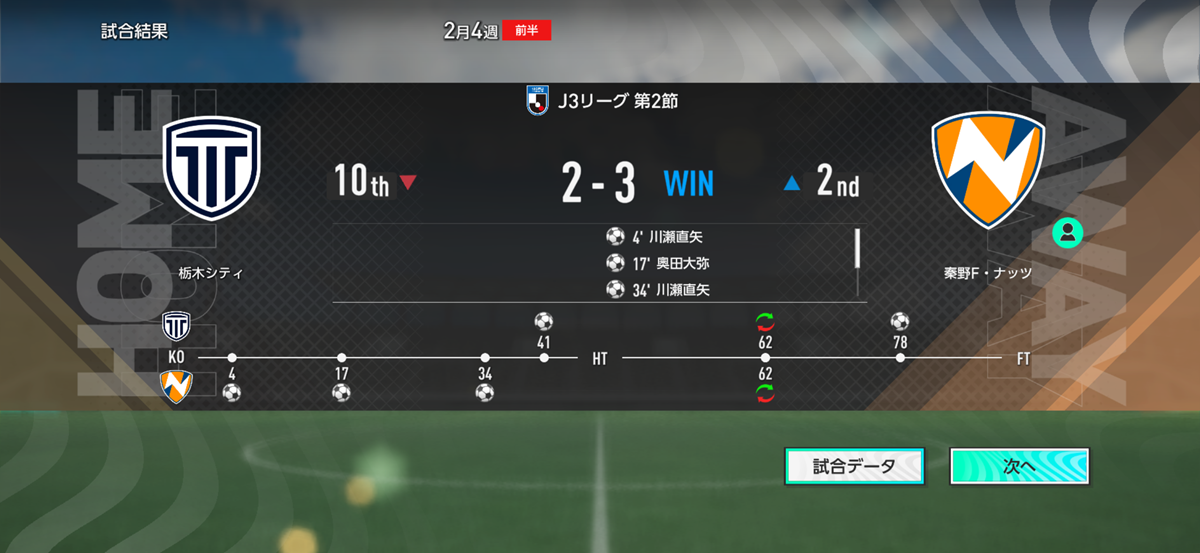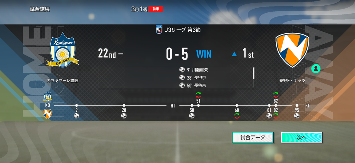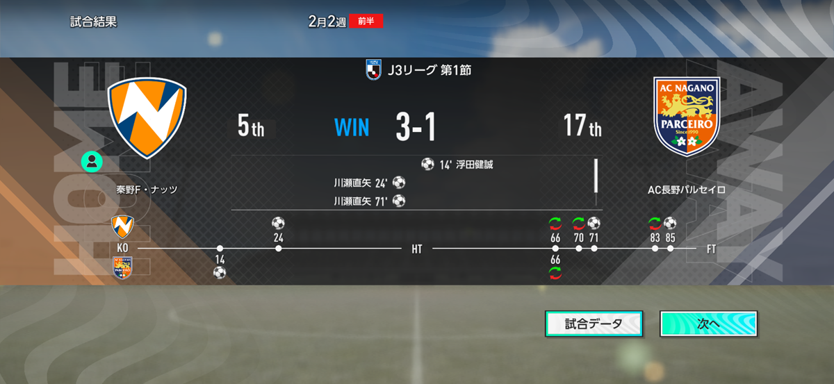 川瀬の同点弾が反撃の狼煙となり、後半に入ってミスター・ナッツとコジが追加点&ダメ押しの3点目を決めて勝負あり! ホームで行われたJ3リーグ開幕戦を勝利で飾った。