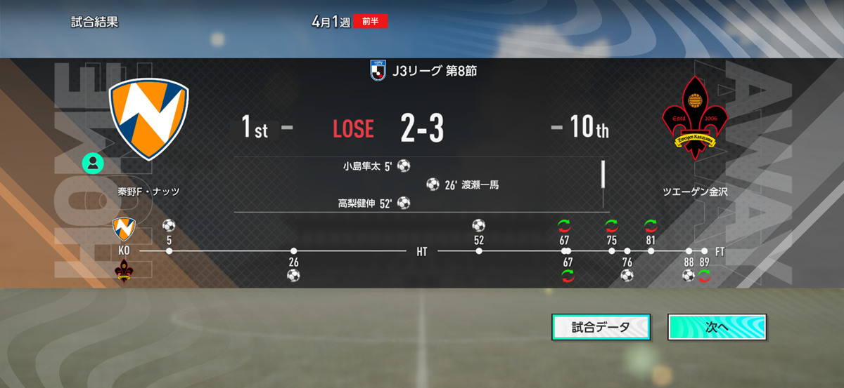 こうして開幕連勝記録は7でストップ。思い起こせば昨シーズン、公式戦無敗記録を8で止められた相手もツエーゲン金沢だったし、勝てば10位以上(スポンサーミッション達成)の可能性があった最終節で土をつけられた相手もツエーゲン金沢だったっけ。完全に秦野F・ナッツの天敵だね(笑)