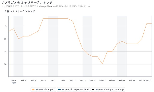 トップ10圏内では、HoYoverseの『原神』が前日の10位から4位に順位を上げてきた。『原神』は、2月25日にバージョンLuna Ⅴ「風を捕まえる帰郷者」をリリースしており、そのアップデート後より新★5「ファルカ(風)」が登場したイベント祈願・キャラクター「北風の凱旋歌」などを開催していることが売上に大きく貢献しているようだ。