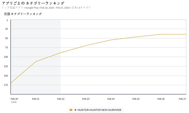 また、ブシロード<7803>とワンダープラネット<4199>が共同開発した新作『HUNTER×HUNTER NEN×SURVIVOR』が40位と徐々にセールスランキングでも順位を上げてきた。『ネンサバ』は、前日2月26日に世界累計170万ダウンロードを突破したことを発表しており、ユーザーのすそ野の拡大とともに順調に売り上げを伸ばしているもようだ。