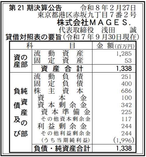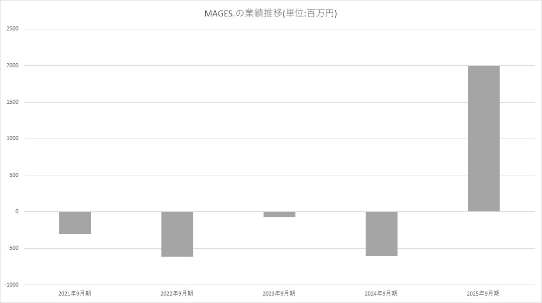 コロプラ<3668>の100%子会社であるMAGES.の2025年9月期(第21期)の決算は、最終利益が19億9600万円と黒字転換を達成した。あわせて債務超過を解消するとともに、累積損失も一掃した。前の期(2024年9月期)の実績は、最終損失6億0800万円だった。2月27日付の『官報』に掲載された「決算公告」で判明した。