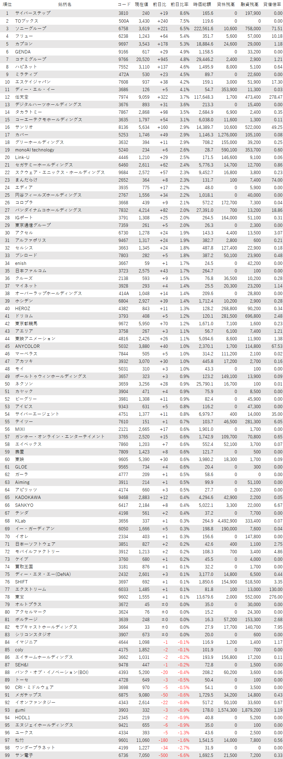 こうしたなか、ゲーム・エンタメ関連企業をみると、登録されている99銘柄のうち、上昇は78銘柄(79%)、下落は16銘柄(16%)、変わらずは5銘柄(5%)で、買い優勢だった。
