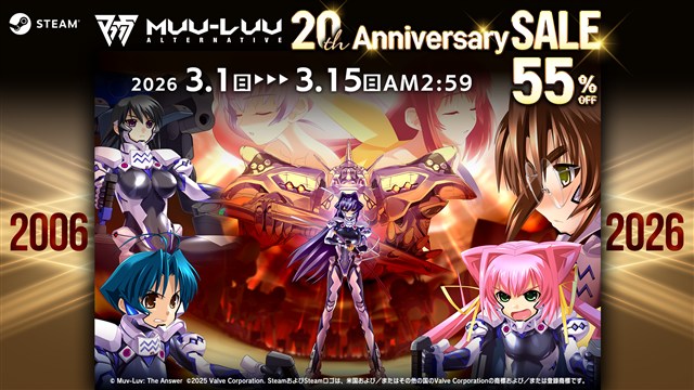 『マブラヴ オルタネイティヴ』発売20周年を記念し、Steamにて「マブラヴ オルタネイティヴ 20th Anniversary Sale」を開催する。今回20周年を迎える『マブラヴ オルタネイティヴ』は55%オフ、その他タイトルも30~60%オフとお得にご購入いただけます。