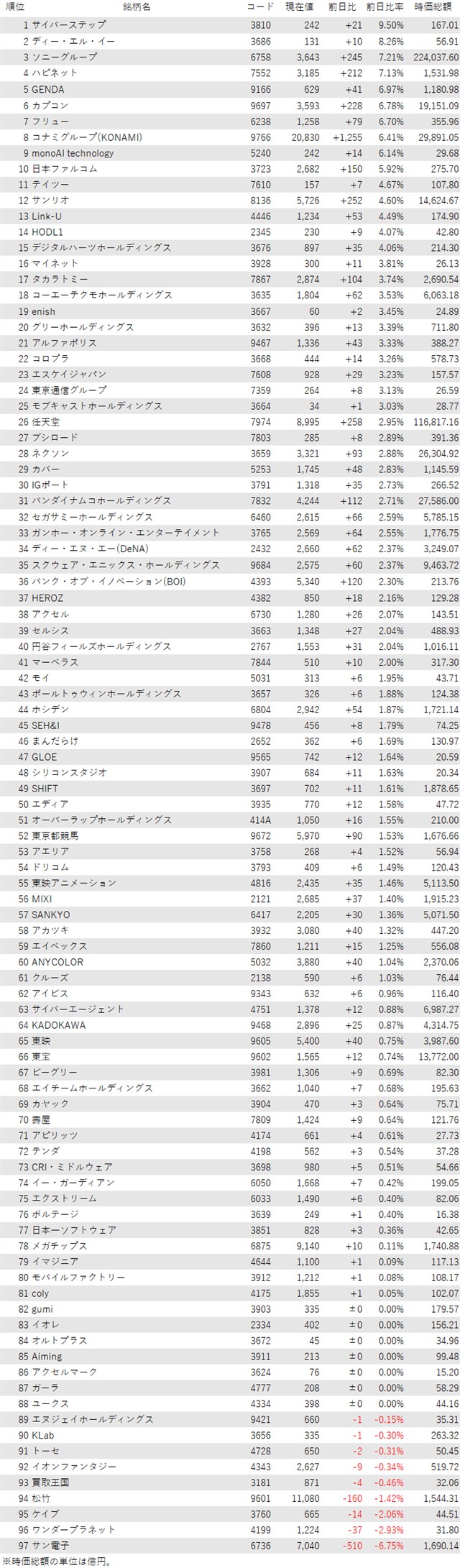 そうした中でゲーム・エンタメ関連株の動きを見てみると、下記の表に登録しているゲーム・エンタメ関連企業97銘柄のうち、上昇は81銘柄(84%)、下落は9銘柄(9%)、変わらずは7銘柄(7%)で、上昇した銘柄が大半を占めた。