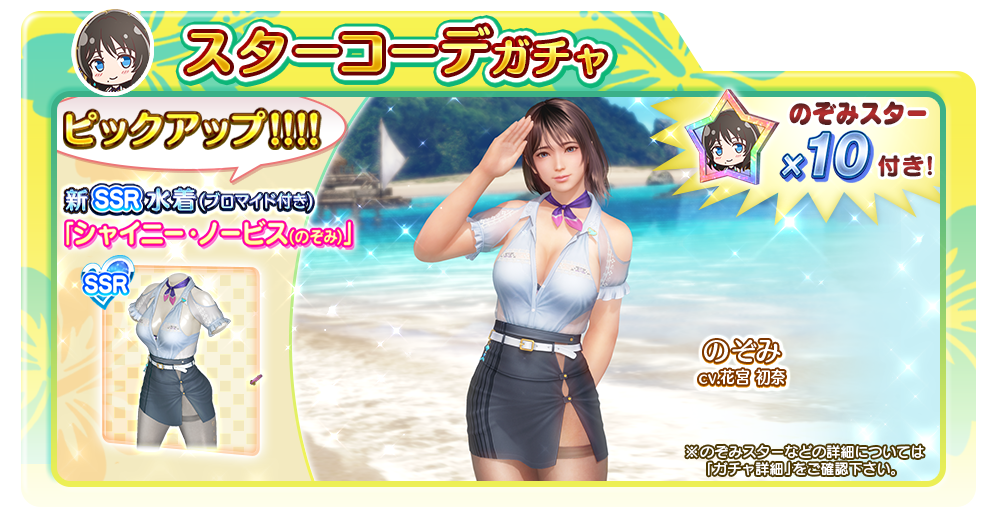 「のぞみ」は、2月26日より開始の「スターコーデガチャ」において、新SSR水着「シャイニー・ノービス(のぞみ)」を入手することで、島に招待できる。