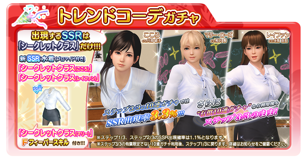 ○内 容 登場する SSR 水着は以下の「シークレットクラス」のみとなる。10連ガチャのステップ3/3では、SSR の出現確率が3.3%になる。