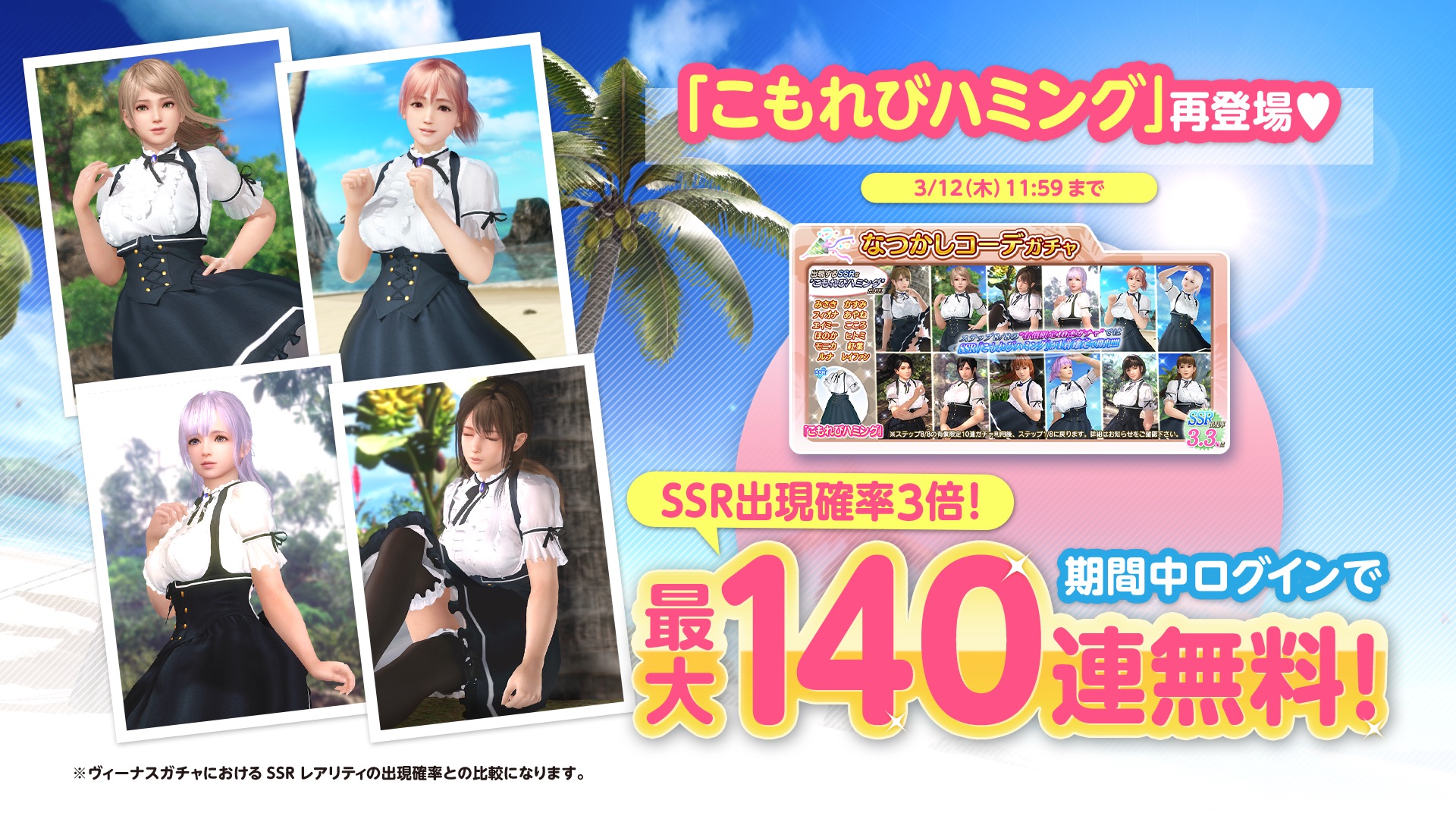 ○備考 ※SSR 水着「こもれびハミング」と女の子の組み合わせは、ゲーム内各ガチャの「ガチャ詳細」を確認してほしい。