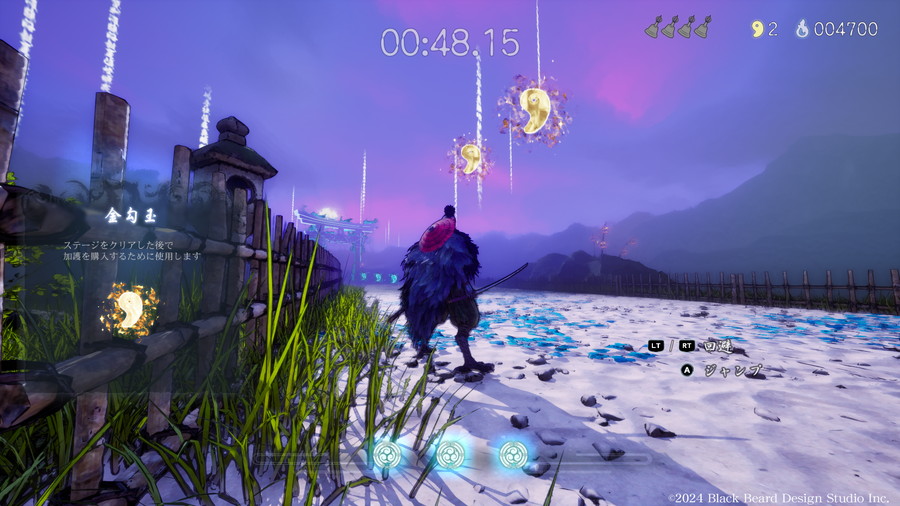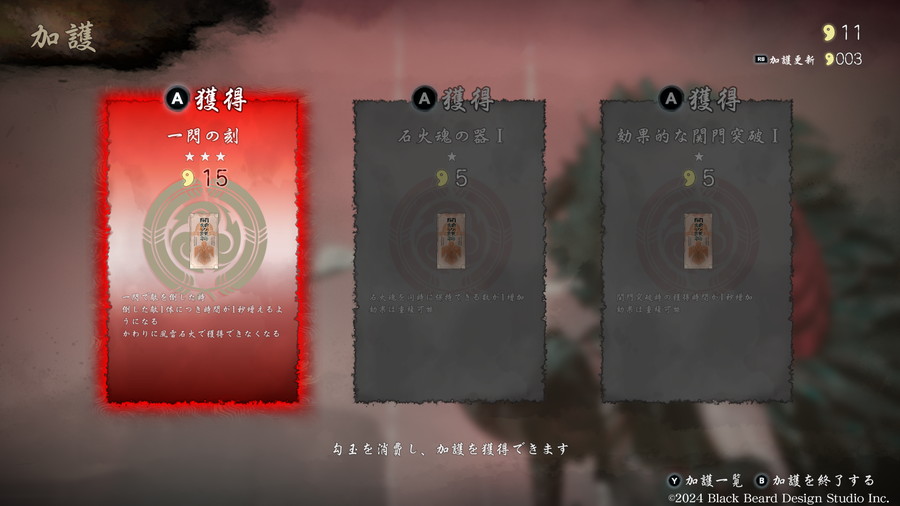 ステージが難しいと感じた場合でも、<能力開放>により颯を強化できる。攻略開始時の制限時間の延長や、風雷石火の強化、正面への高速移動である瞬歩など多彩な成長要素があり、ジャンプを強化すれば二段ジャンプ・三段ジャンプも可能となる。強化素材の“魂石”はクリア時だけでなくゲームオーバー時にも獲得できるため、挑戦を繰り返すことが攻略の糸口となる。また、<金勾玉>を入手することで、ステージクリア後に<加護>による一時的な強化効果を得られる。