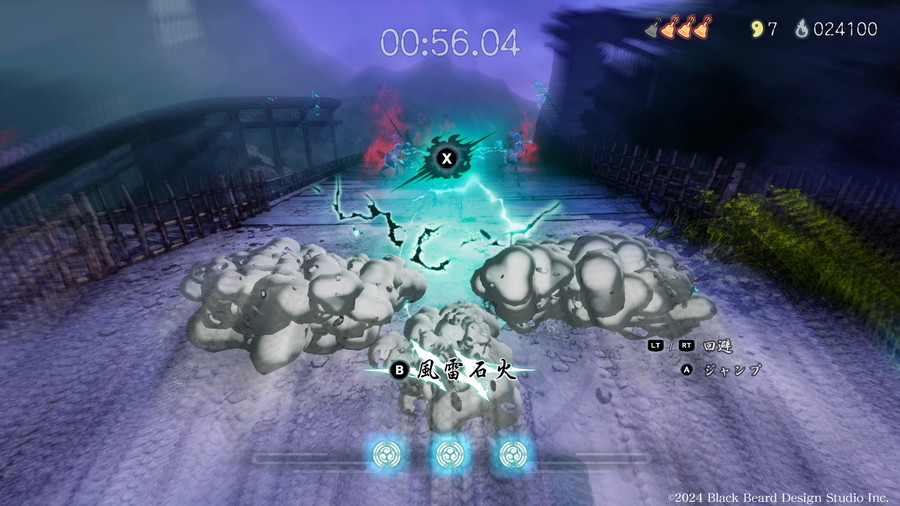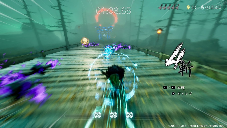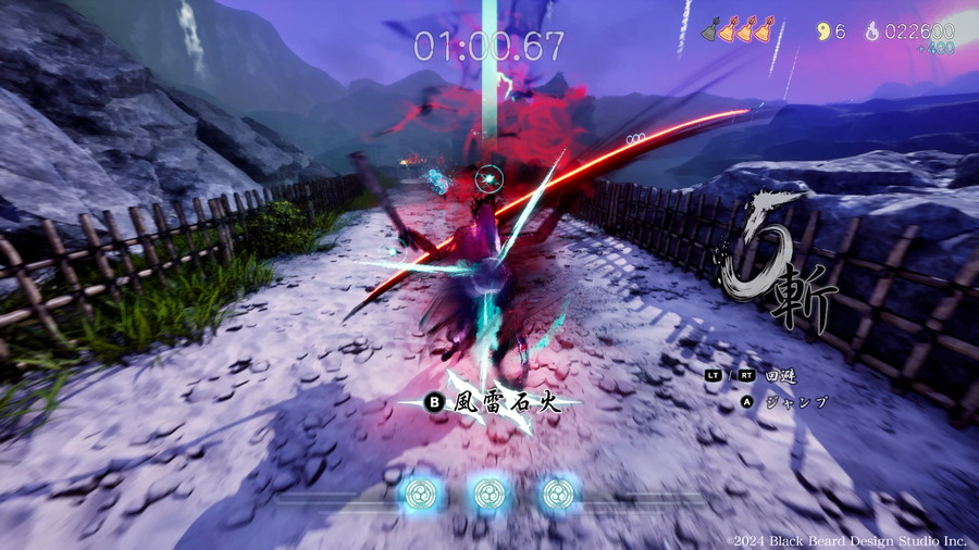 主人公・颯は黄泉の世界を駆ける鴉天狗。雷光のような剣技と一陣の風のようなスピード感あふれる技を駆使して敵に立ち向かう。強力な奥義<風雷石火>は、敵を斬った数だけ制限時間(夜明けの儀式までの時間)を延ばすことができる必殺技で、「時間=生命線」である本作において残り時間の獲得に直結する。ステージ攻略には、壁に飛びついて自動的に駆け上がる<壁走り>、狙った方向へ瞬時に移動できる<飛符>、素早い正面・横移動を可能にする<瞬歩>や<回避>といった能力を組み合わせ、縦横無尽に駆け巡るアクションが求められる。