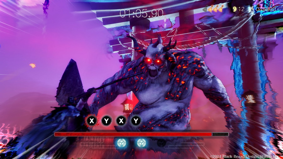 クリア条件は制限時間<1分>以内にステージ最奥のボスを撃破すること。敵が跋扈する世界で、わずかな時間の中、緊張感あるランアクションを楽しむことができる。素早い突進攻撃で体力を削る<槍鬼>や、間合いに入った瞬間に倒さなければ即死攻撃を繰り出す<大鬼>など、一筋縄ではいかない特性を持つ敵たちとのバトルでは、常に判断力と瞬発力が試される。