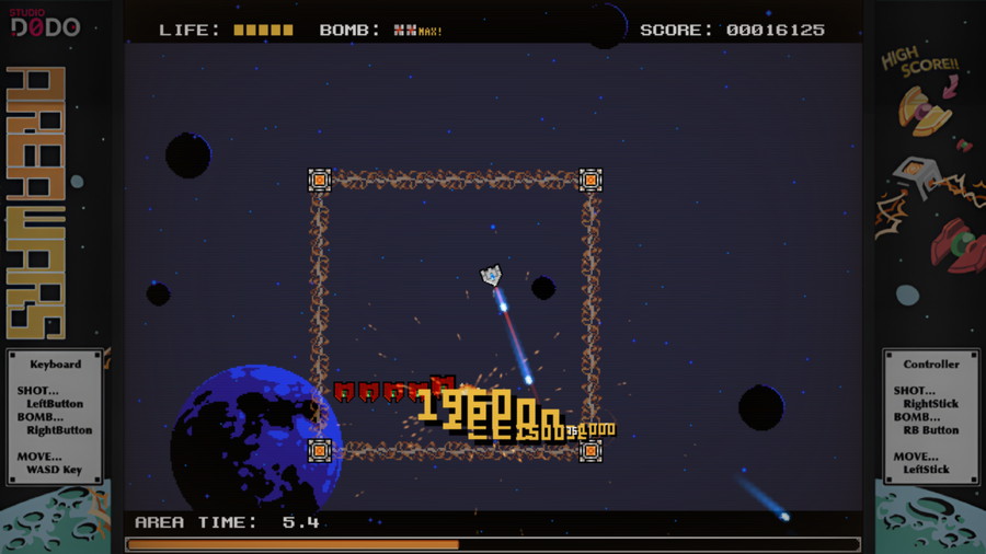 ・爽快感抜群の「連鎖爆発」:敵を撃破すると、その爆発が周囲の敵を巻き込みさらに連鎖する。連鎖数に応じてスコアの倍率が上昇し、敵を撃破する順番やタイミングに工夫を凝らすことで超高得点を狙える。