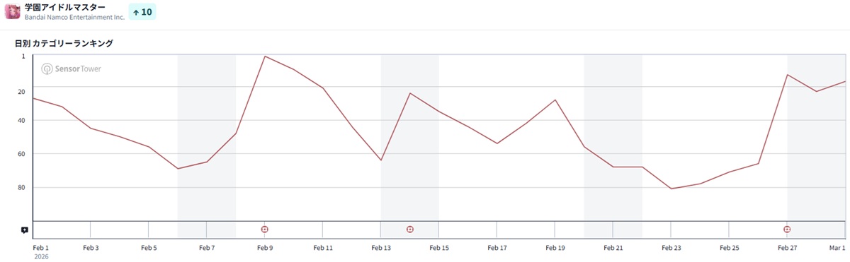 また、有償ジュエル2,500個で一回限り、SSR PアイドルかSSRサポートカードを一枚以上確定で入手できる初星音楽祭打ち上げガシャDAY2を3月9日(月) 10:59まで実施しており、それら施策が順位を押し上げたもよう。