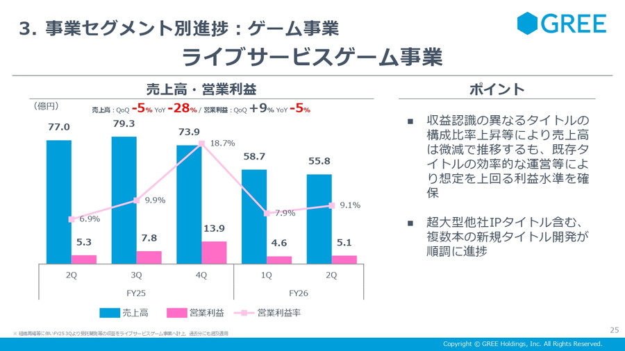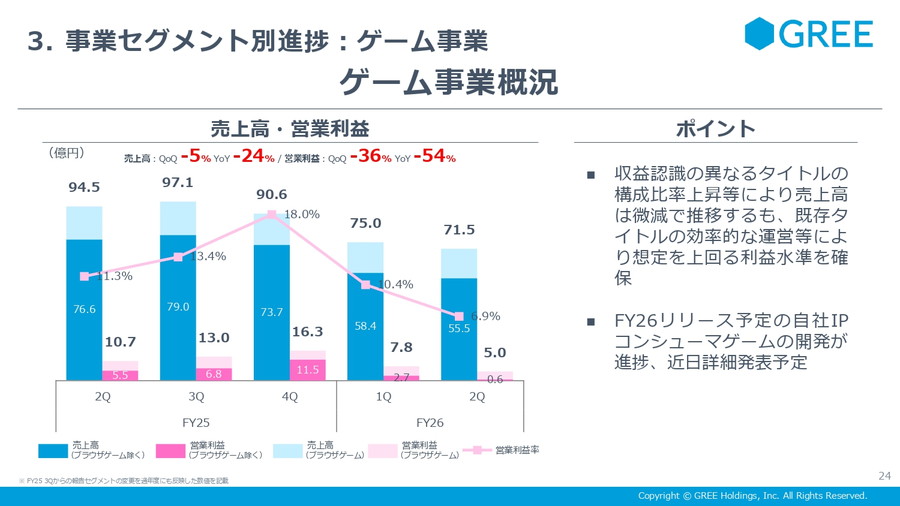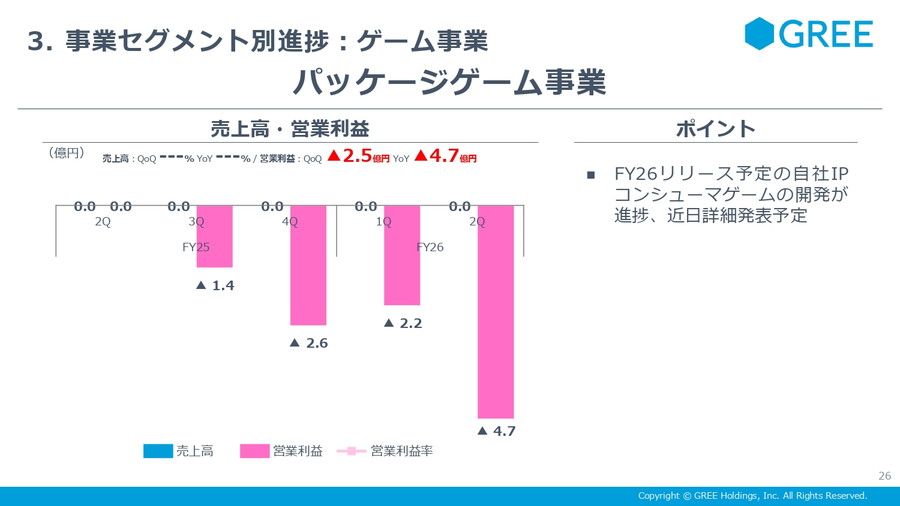 ■ゲーム事業:売上71億円・営業益5億円 超大型タイトル開発を継続、FY26新作は3Q発表へ