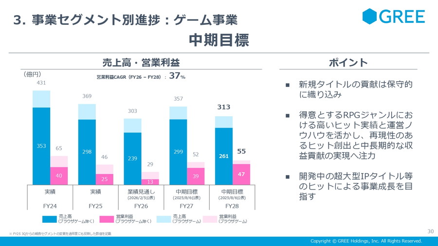 中期計画では、新規タイトルの貢献により26年度を底に反転を目指す構えだ。短期的な既存タイトルの変動はあるものの、将来のヒット創出に向けた仕込みは着実に進んでいる。