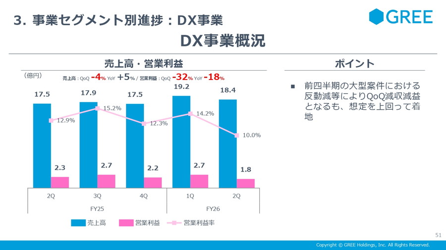 DX事業は売上18億4000万円、営業利益1億8000万円。大型案件のあった前四半期比では減少したが、ベースラインは着実に積み上がっている。