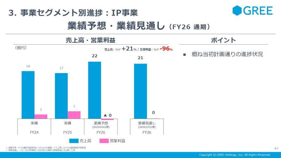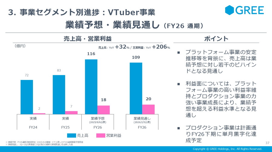 VTuber事業は通期売上高109億円、営業利益20億円(前年比約2倍)を見込むなど、全社収益を下支えする存在へと拡大中。IP(アニメ)事業も概ね計画通りに進捗している。