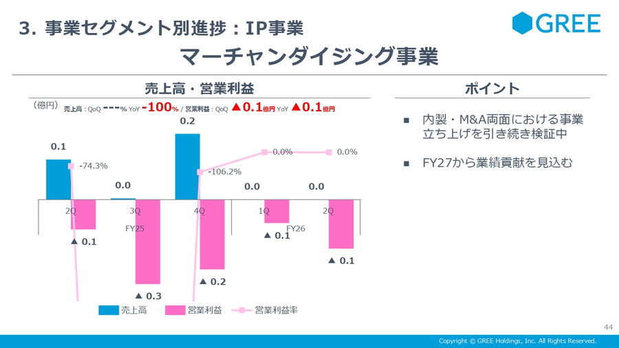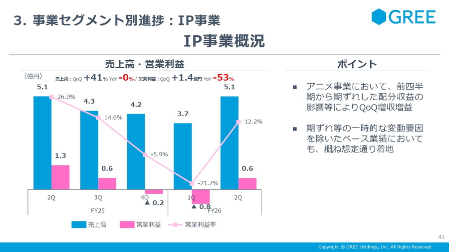 IP事業は売上5億円と前四半期からの40%増収と大きく伸び、営業黒字に転換した。前回期ずれしたアニメ配分収益が計上されたことが主因だ。