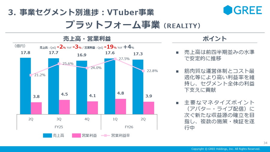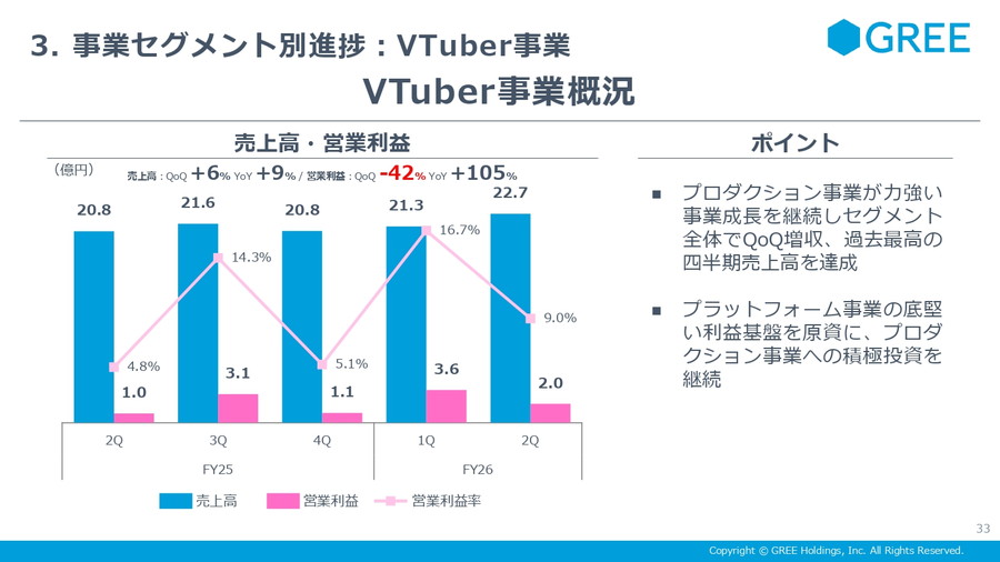 大幅な減益となったが、固定費は前四半期比で約6億円増加したことによる。人件費の一過性増加や、コンシューマーゲーム開発およびVTuberプロダクション事業への先行投資が主因という。