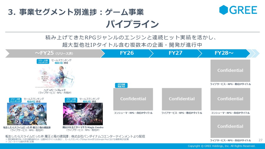 特に注目されるのが、FY26リリース予定のコンシューマーゲームだ。四半期あたり2~5億円規模の開発投資を行っており、第3四半期中に正式発表を予定しているという(※決算発表の翌日に発表した『アナザーエデン ビギンズ』のことと思われる)。パイプライン自体に変更はなく、27年以降の大型IPライブサービス案件も進行中という。