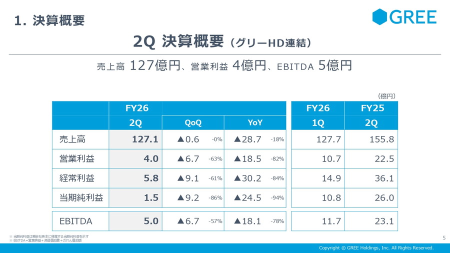 グリーホールディングス<3632>の2026年6月期 第2四半期決算は、売上高は127億円、営業利益は4億円、経常利益は5億8000万円、最終利益1億5000万円と前年同期比、前四半期比で減益となった。為替差益の計上もあり、経常利益は営業利益を上回った。4セグメント(ゲーム、VTuber、IP、DX)の合計では売上高121億円、営業利益6億円となり、収益性改善により想定を上回る水準で着地した、としている。