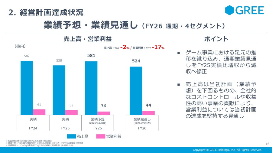 2026年6月期の通期の4セグメント(ゲーム、VTuber、IP、DX)の業績見通しについては、ゲーム事業における既存タイトルの足元動向を精査した結果、売上高を下方修正した。一方で、コストコントロールの徹底や継続成長事業(VTuber、IP、DX)の伸長を背景に、営業利益の確保を目指す方針としている。