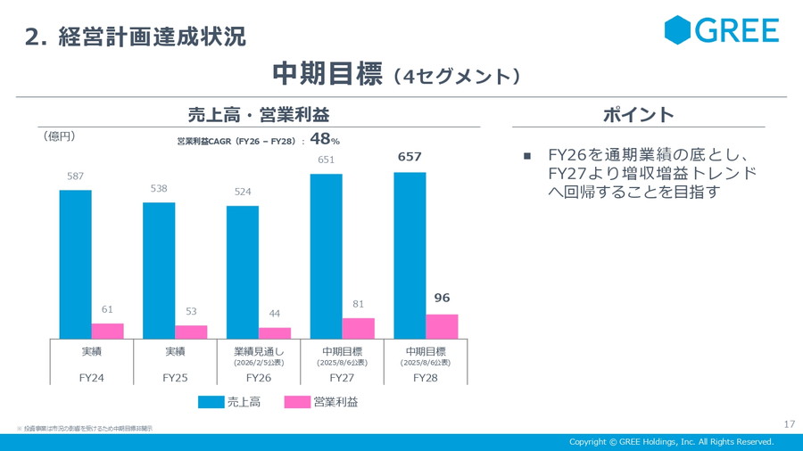 4セグメントの中期目標については、今回の通期見通し修正を受けても変更はない。