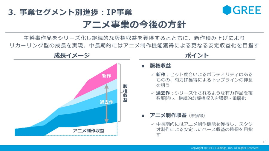 同社のアニメ戦略は、「版権収益」と将来的な「制作収益」の二層構造を目指しているという。特に版権収益では、新作単発型ではなく、第2期・第3期へとシリーズ化され長期的に収益が積み上がる“ミルフィーユ型"構造を志向している。