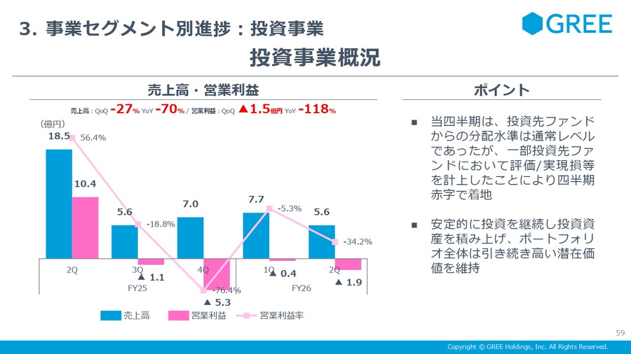 投資事業については、当四半期の説明は限定的にとどまった。投資損益は評価益やEXITの有無によって振れ幅が大きく、業績のボラティリティ要因となりやすいセグメントである。