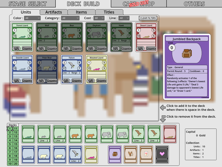 ・戦闘に勝利してカードを入手し、自由に組み合わせて好みのデッキを作れる。デッキは20個まで保存可能だ。