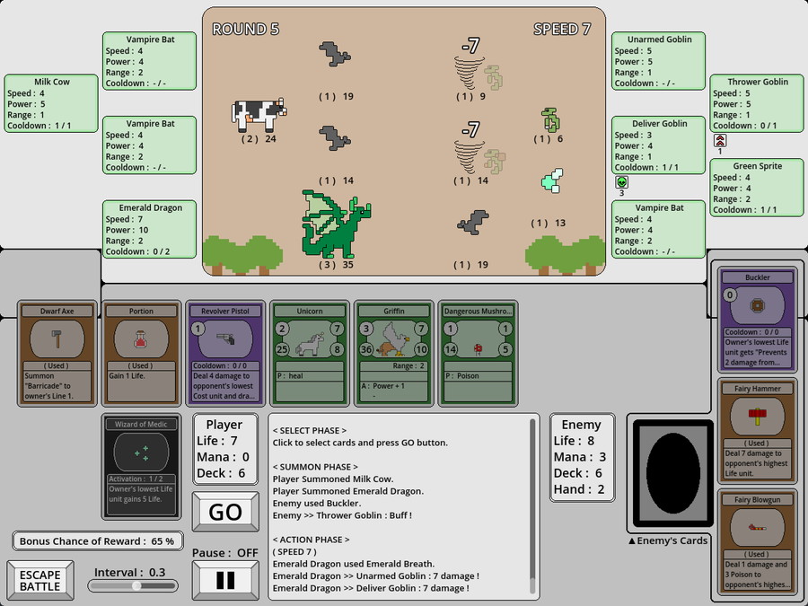 ・戦闘中の操作は、ラウンド毎に手札から使用するカードを選択し、GOボタンを押すだけだ。それ以外はすべて自動で進行する。