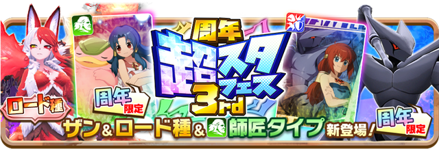 「3rdアニバーサリー記念ミッション」を開催する。ログイン初日には初登場の師匠タイプ「フレリア」が手に入る「SSRフレリア引換券」がもらえるほか、ミッションをクリアすることで専用の強化アイテム「古代トチカの証」をすべて集めてSSRフレリアを上限解放して★4にできる。さらに、「極意の書・急」、「★3円盤石」、「周年超スタ3rdチケット」、「3rdアニバーサリーチケット」などの豪華報酬も入手可能。