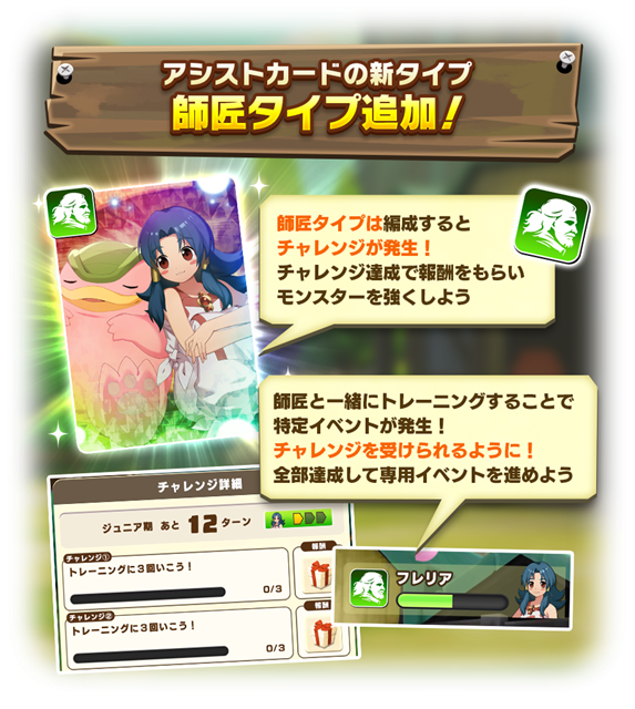 初登場となる師匠タイプのカードでは、育成プレイの3つのフェイズ「ジュニア期・ミドル期・プロ期」でそれぞれ目標提示してくる。目標を達成することで、強力な能力や育成アイテムを得られる。