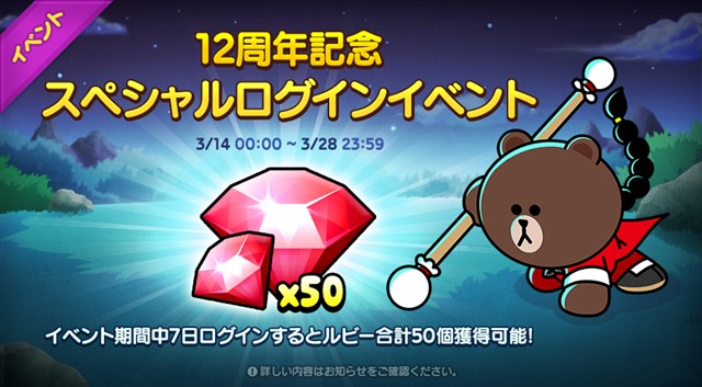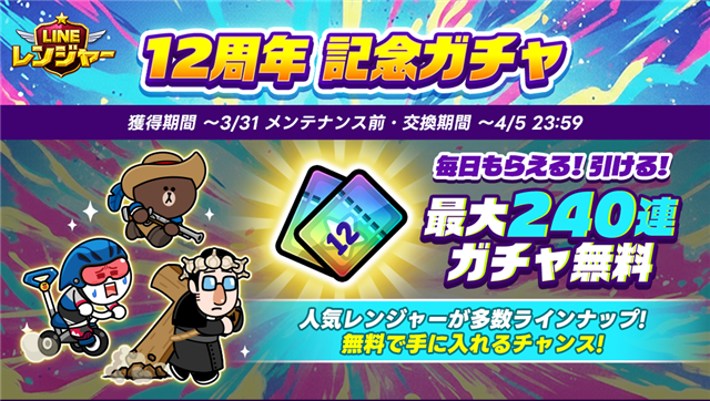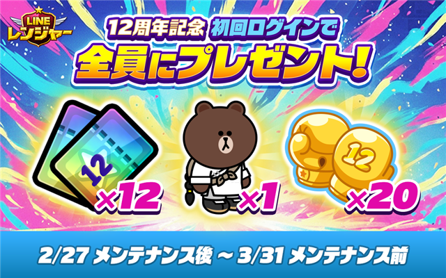 期間中に『LINE レンジャー』へ一回ログインするだけで、『★8 修行の身 ブラウン』や『12周年ガチャチケット』などをプレゼントする。『★8 修行の身 ブラウン』は、ログインと交換ショップだけで『★9 黒龍の侠客 ブラウン』にまで進化させることができる。