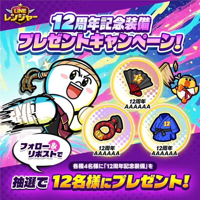 『LINE レンジャー』の公式X(旧Twitter)をフォローして対象投稿をリポストすると、抽選で12名にランダムで「12周年限定装備」1種をプレゼントする。