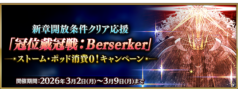 FGO PROJECT(有限会社ノーツ、株式会社アニプレックス、株式会社ラセングル)は、スマートフォン向けFateRPG『Fate/Grand Order』にて、本日2026 年3 月2 日(月)に期間限定『新章開放条件クリア応援「冠位戴冠戦:Berserker」ストーム・ポッド消費0!キャンペーン』を開催する。